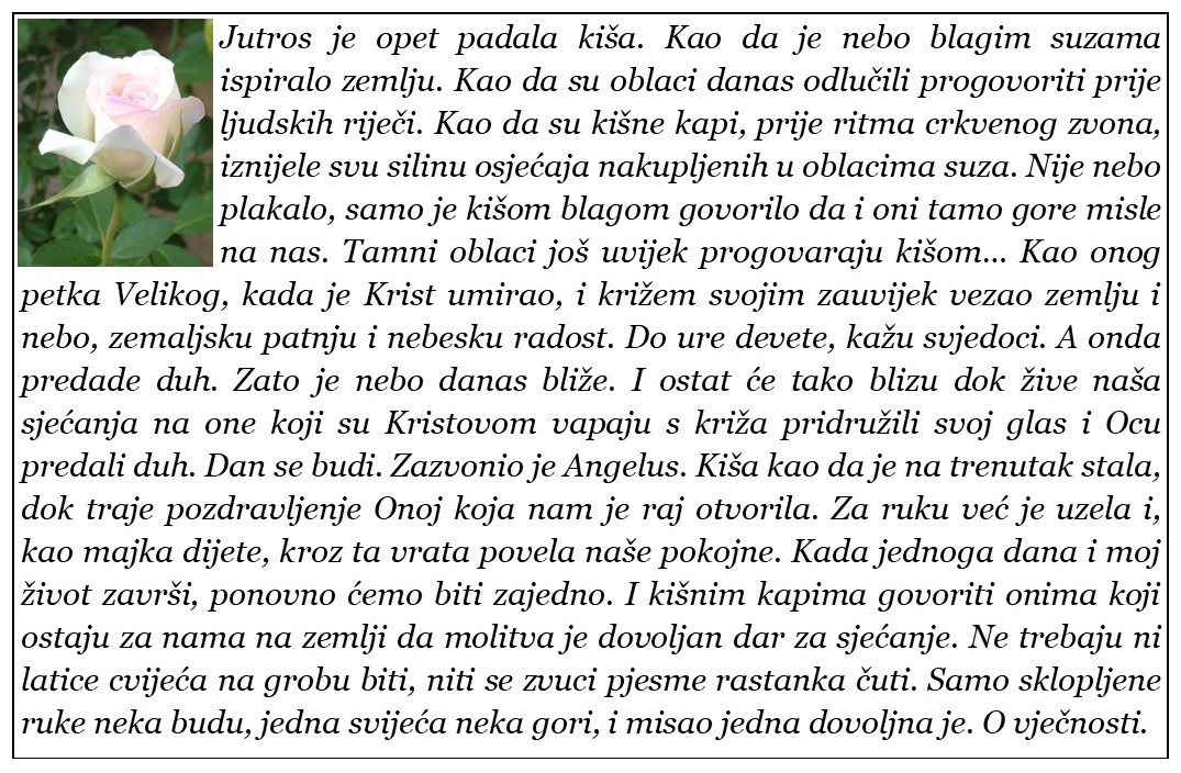 I još nešto: molite od danas malo više nego prije. Molite i zahvaljujte Isusu za svoje roditelje, bake i djedove, rodbinu, prijatelje, učitelje i vjeroučitelje, nastavnike, svećenike i za sve koji su dio sebe ugradili u vaše odrastanje, odgoj i obrazovanje.