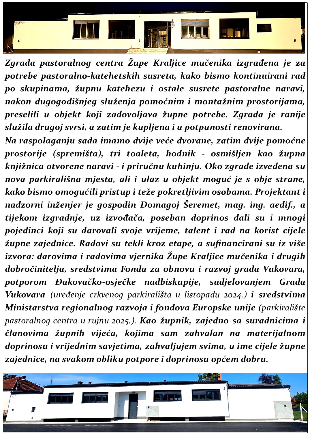 Hvala svima vama, dragi vjernici, koji cijelu godinu živite sa svojom župom, koji redovito dolazite na svete mise i ostale duhovne sadržaje. Vama, koji nalazite u crkvi svoj mir i ispunjenje svojih duhovnih potreba, želim da uvijek ostanete ponizni pred Bogom i dobri prema ljudima. Svi smo potrebni Božjeg milosrđa i njegove pomoći, a cilj života župne zajednice je upravo u pronalaženju Božje blizine i ljudskom zajedništvu. Neka vas sve prati zagovor naše nebeske Majke, Kraljice mučenika, i neka vas čuva Božji blagoslov. Sretan vam i blagoslovljen Božić.
