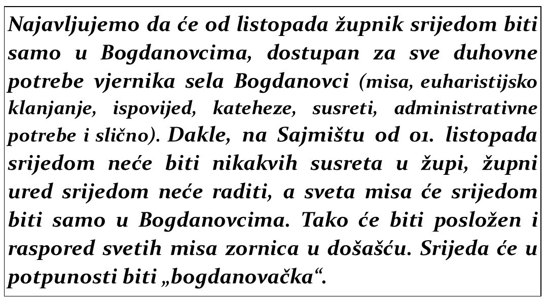 - prvopričesnici u Bogdanovcima: srijedom u 16:00 sati.