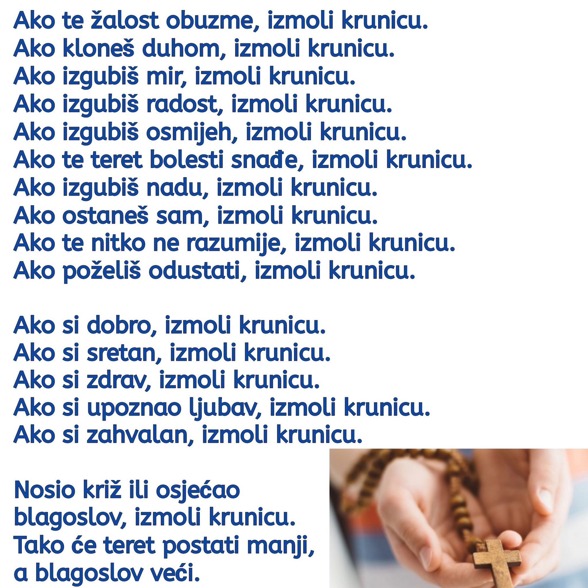 Zadržite svoje dostojanstvo, koliko god takozvanih prijatelja izgubili radi toga. Boga se sjetite i kada ste sretni i kada ste nesretni. Nemojte nikada vikati da je Bog kriv ako vam u životu nešto ne ide. Bog nije kriv za čovjekove neuspjehe, ako ga čovjek isključuje dok je sve dobro i traži ga tek u nevolji. Zahvaljujte Bogu na svakom novom životom koraku. Neka vas na životnom putu prati snaga Duha Svetoga. I za kraj, vjerujte mi, sve će biti dobro.